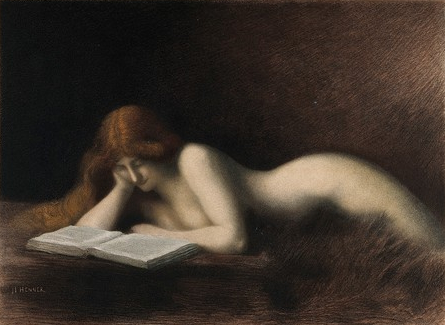 A woman with long red hair is lying down reading a book. Coloured mezzotint by Jean Jaques Henner. Wellcome CollectionCC BY