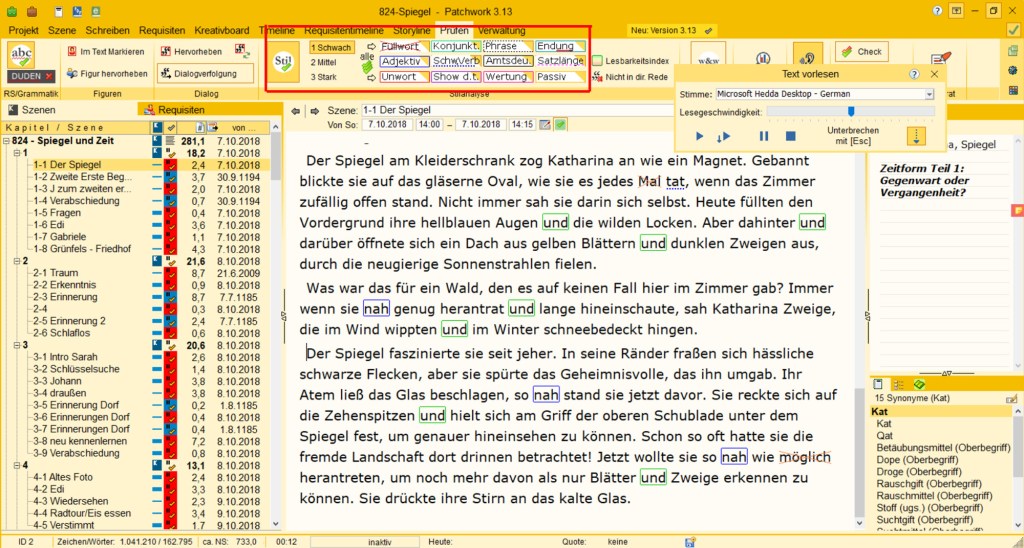 Habe ich meine Szene mit der Stil-Prüfung bearbeitet, lasse ich mir noch Wortwiederholungen anzeigen. Beim Ersetzen immer wieder verwendeter Wörter hilft dann im Zweifel auch das integrierte Synonymwörterbuch. In manchen Fällen ist dieser Schritt aber auch sehr kniffelig. Auf dem Screenshot hier habe ich die meisten Wiederholungen schon beseitigt…