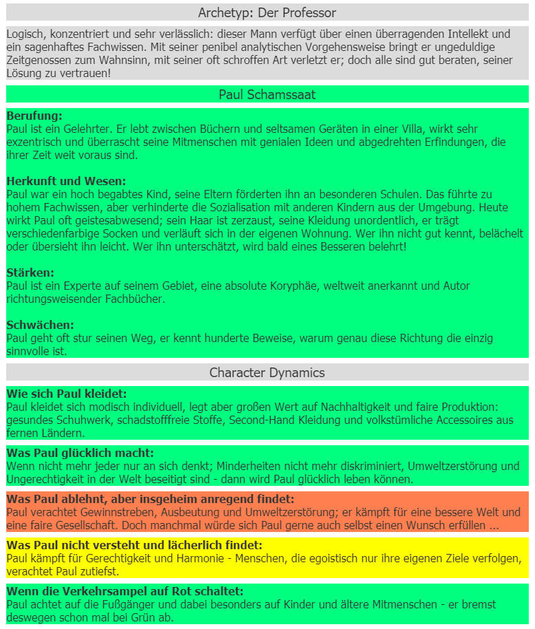 Auch bei der Erstellung von Charakteren gibt es einige Hilfsmittel, die ich aber noch gar nicht so genau ausprobiert habe. Als Leitlinien gibt es verschiedene Typen, in die sich Figuren einteilen lassen und die gerne wieder auftauchen – zum Beispiel die Frohnatur, der Freund, der Wissenschaftler… Die meisten Autorenprogramme (auch das von mir gern zitierte) haben dazu integrierte Hilfsmittel und Tools, die bei der Erstellung leiten. Dann kann man beispielsweise Steckbriefe und Fragebögen zu jeder Figur ausfüllen. Verschiedene Charakerbögen finden sich auch zum Download an verschiedenen Stellen im WWW. Witzig finde ich den Charaktergenerator von ebookboss. Natürlich würde ich eine so erstellte Figur nicht 1:1 übernehmen, aber als Inspiration ist das manchmal vielleicht nicht schlecht.