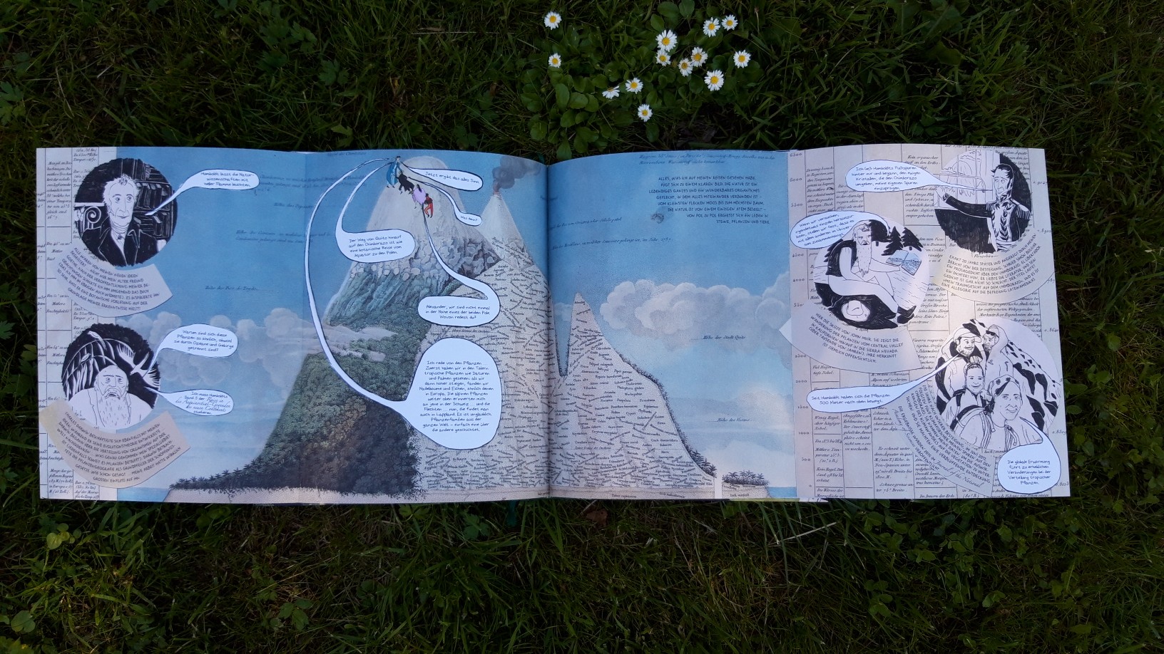 Für das Buch hat Andrea Wulf verschiedenste historische Quellen angezapft, die auf den letzten Seiten alle säuberlich aufgelistet und verlinkt sind. Lilian Melcher hat ihre Zeichnungen mit originalen, von dieser Reise mitgebrachten gepressten Pflanzen kombiniert. Collagenhaft hat sie Humboldts handschriftliche Notizen, Briefe und Zeichnungen eingebaut. Trotz dieser Farbigkeit und dem erzählerischen Witz, verliert das Buch doch nie die vielen Entdeckungen, die wissenschaftlichen Erkenntnisse und die Akribie, mit der Humboldt zu Werk ging, aus dem Blick.
